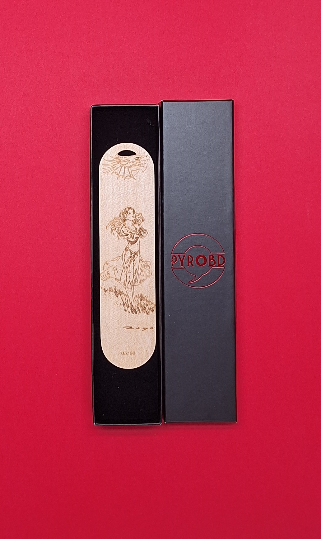 Marque-page pyrogravé représentant une petite fille faisant la connaissance d'un dragon qui devient son ami.