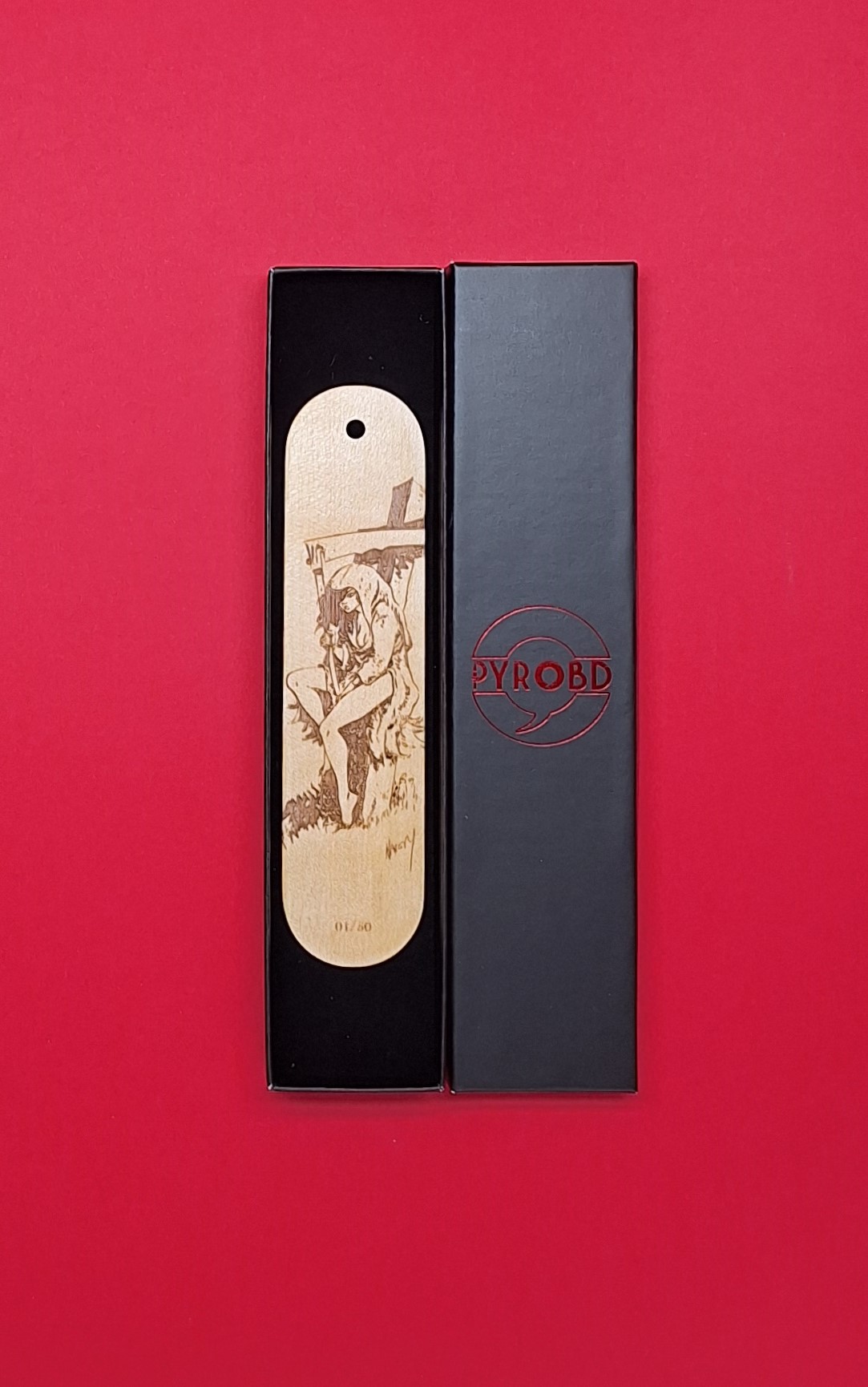 Marque-page pyrogravé représentant la mort d'après la série Pierre Tombal dessiné par Marc Hardy et scénarisé par Raoul Cauvin.