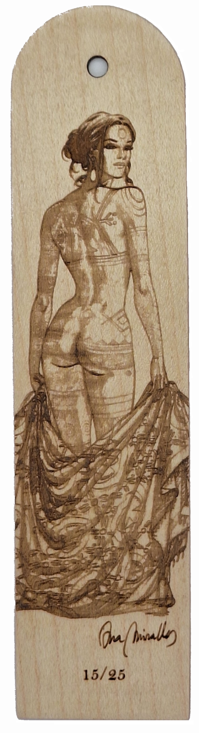 Ce marque-page en pyrogravure représente Kim Nelson, un des personnages importants de la série Djinn dessiné par Ana Miralles et Jean Dufaux au scénario. A savoir que Kim Nelson est la petite fille de Lady Nelson pour laquelle j'ai réalisé un tableau A3 que vous trouverez également sur ce site.
