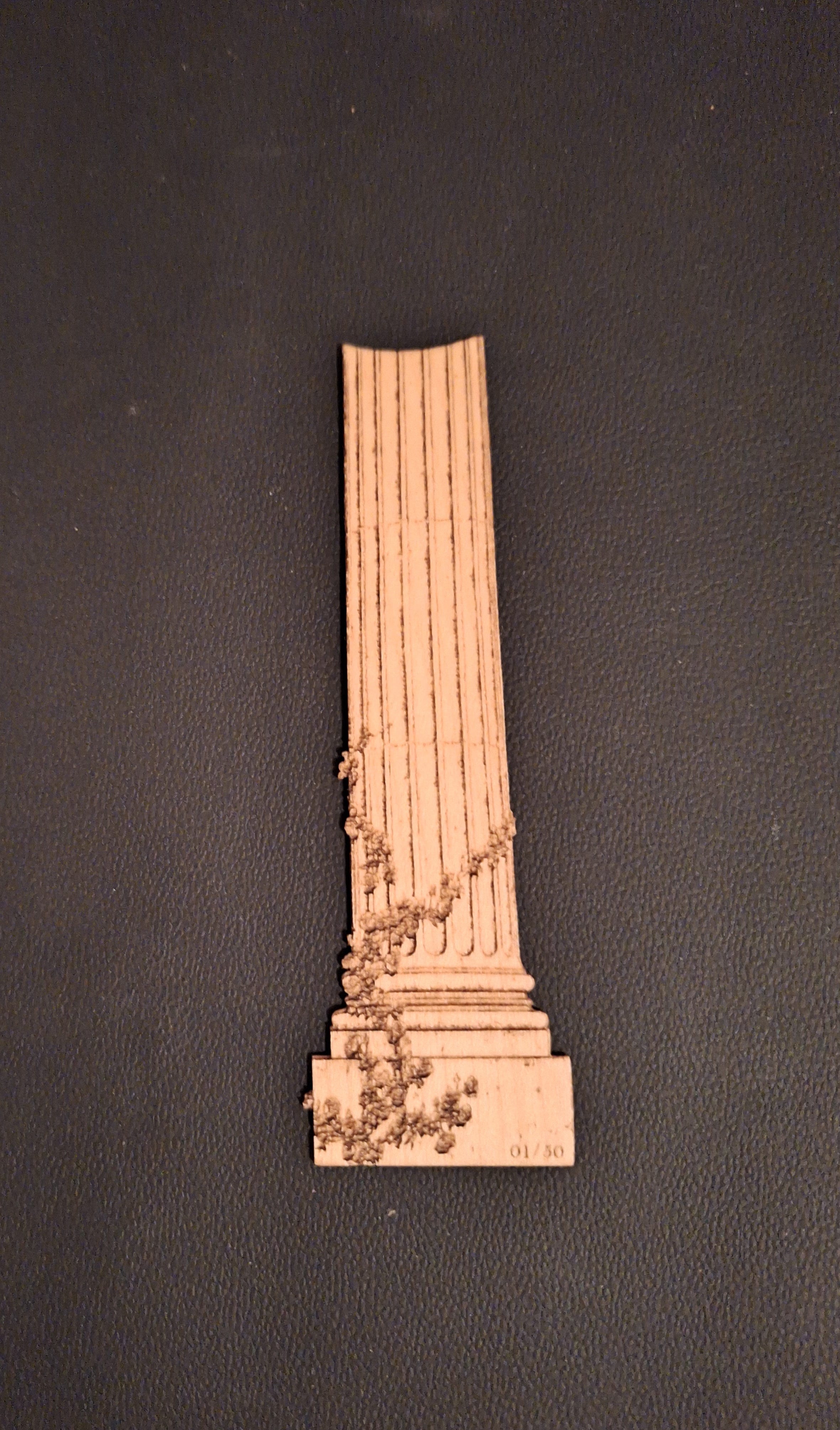Ce marque-page est réalisé en pyrogravure sur du sycomore de 1mm d’épaisseur, représente la colonne du 4ème plat des albums d’Alix et est dessinée par Jacques Martin.