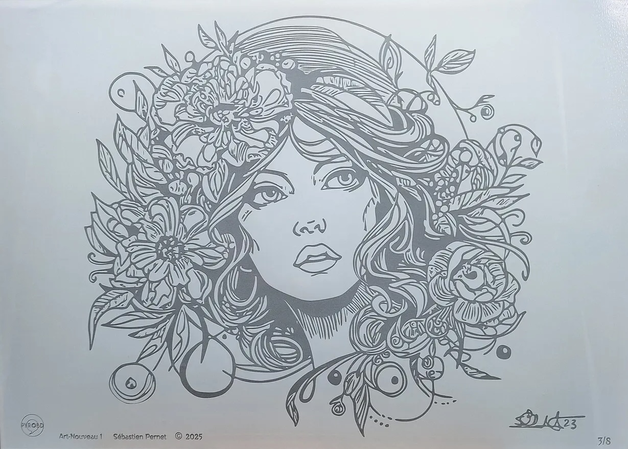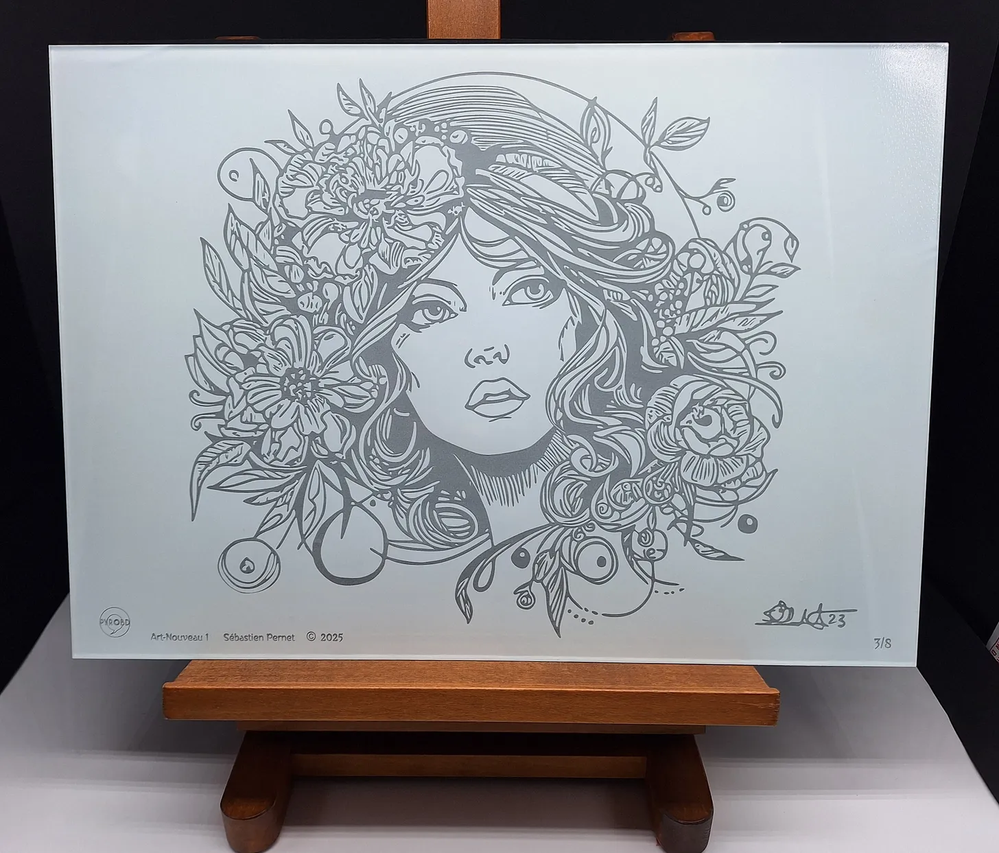 Gravure sur verre blanc d’après un dessin de Sébastien Pernet sur le thème Art Nouveau.